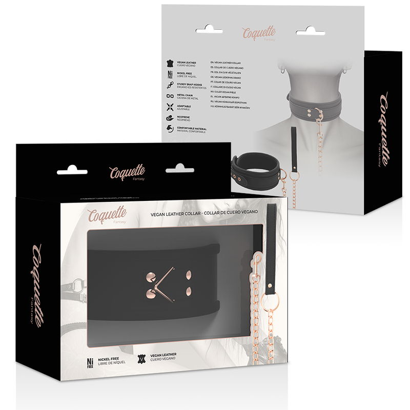 Collare BDSM in pelle vegana con dettagli e guinzaglio in metallo dorato senza nichel. 100% regolabile tramite fibbia. Robusto collare alla schiava perfetto anche per utilizzatori più esperti. Accessorio bondage della collezione “Fantasy” by Coquette per giochi di dominazione o sottomissione.