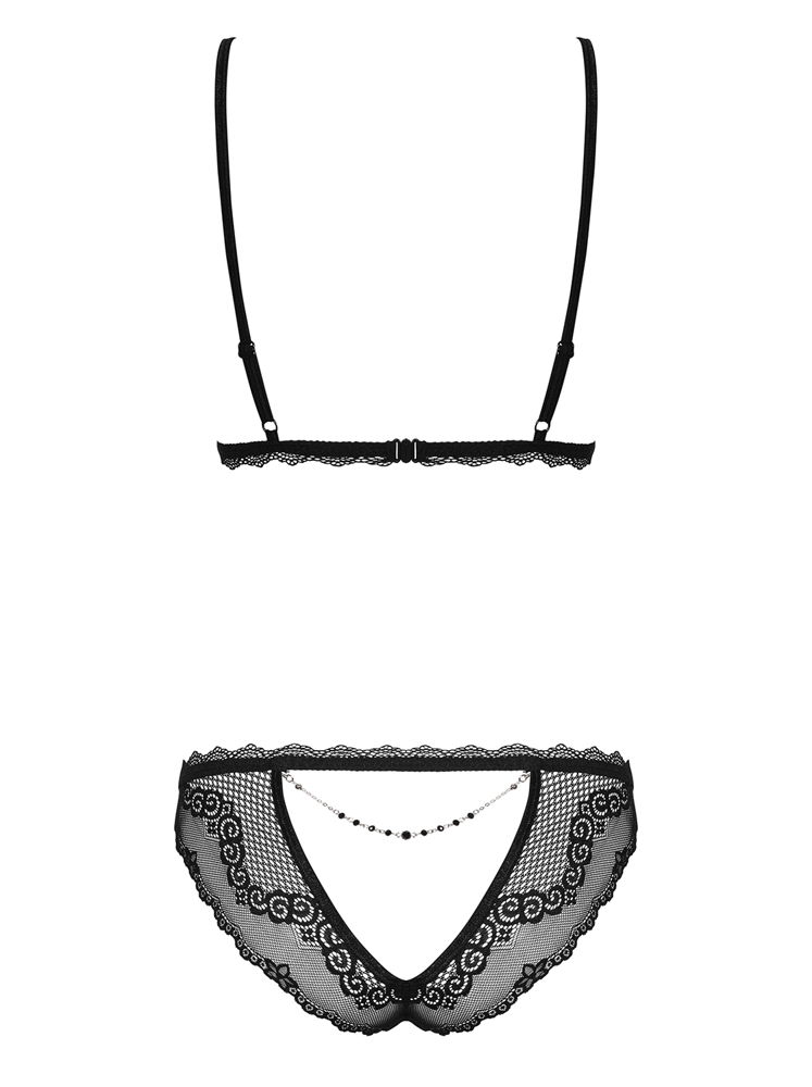 “Millagro Set” by Obsessive completino intimo sexy composto da panties e reggiseno, di colore nero, realizzato in tessuto morbido ed elastico dalle velate trasparenze con bellissime rifiniture effetto pizzo.
