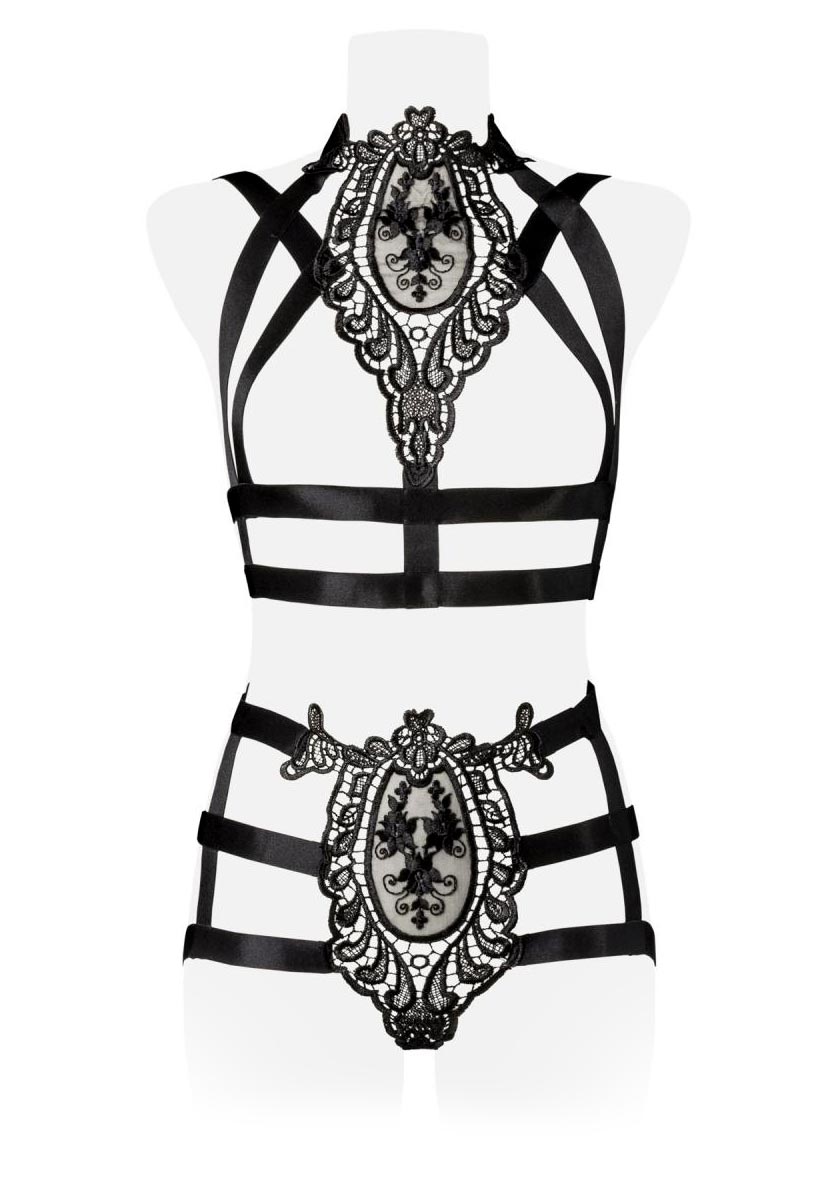 Questo set miscela bene il romanticismo classico ad un’atmosfera bondage. Può essere indossato sotto ad tailleur o con una giacca aperta per mettere in mostra l’elegante pizzo sul petto.
