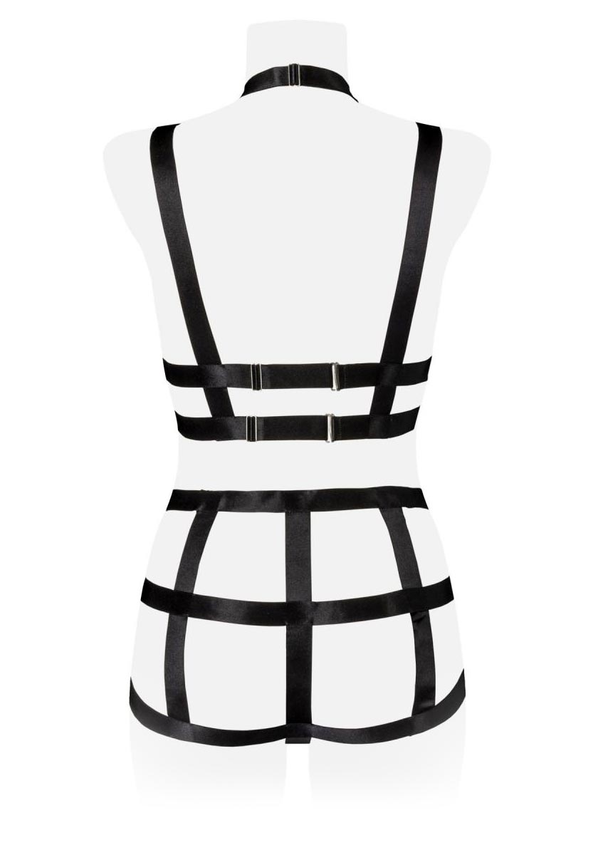 La parte superiore dell’harness lascia i seni scoperti aumentando l’erotismo di questo set e, grazie al doppio gancio sul retro, resta completamente regolabile per una perfetta vestibilità.
