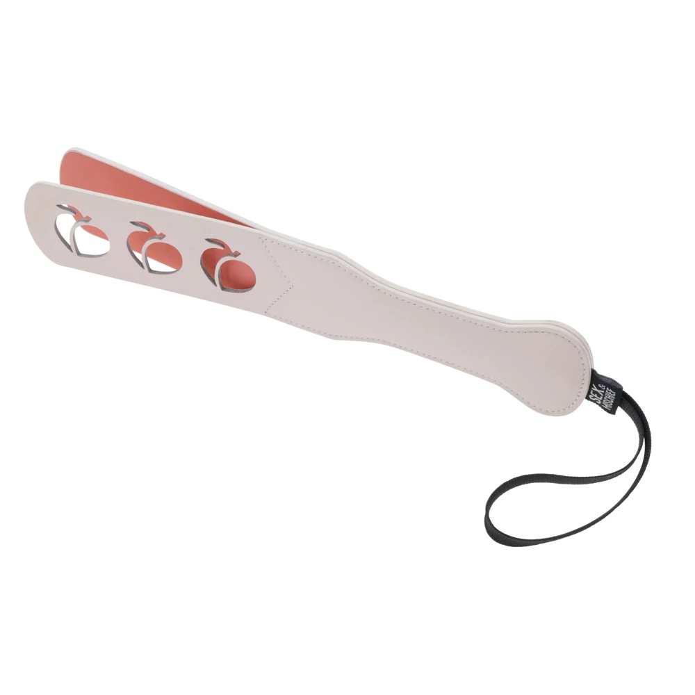 Realizzata in finta pelle e decorata con adorabili ritagli a forma di pesca, è tanto affascinante quanto efficace. Le estremità aperte, tipiche degli slapper, producono uno schiaffo soddisfacente, mentre i ritagli aggiungono un tocco giocoso ad ogni colpo sul “culetto” del/la sottomessa. Resteranno magari segni rossastri o al contrario avremo rosee pesche su un gluteo arrossato? Scoprilo!